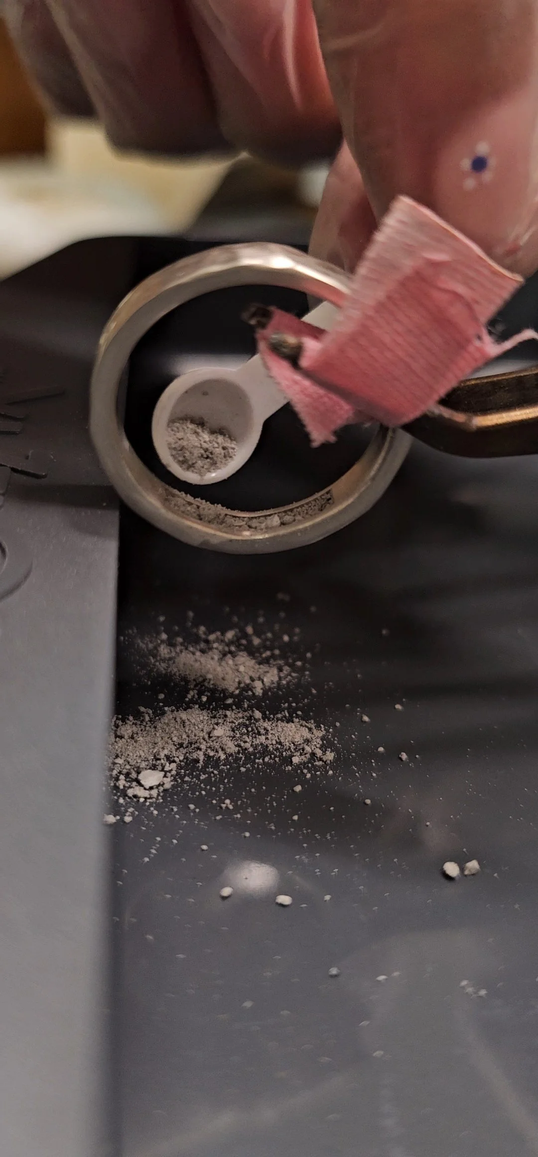 Once the ring has been completely fabricated and 90% polished, we begin to carefully add your loved ones ashes to the inside of the ring.